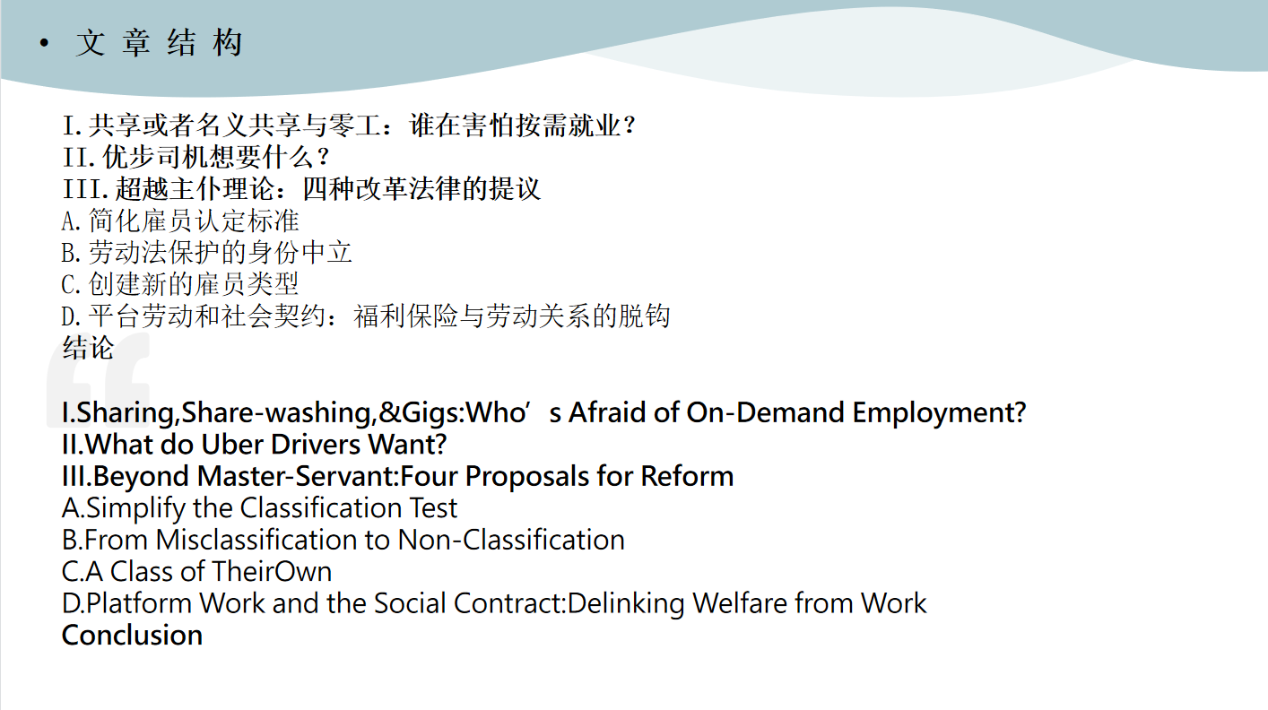 这是文章的结构,第一部分是关于共享经济和零工经济的介绍,以及它们对社会的消极和积极影响;第二部分是关于优步司机需求的社会调查;第三部分是作者关于未来劳动法律范式的四个构想。第三部分是这篇文章的论证核心,第一部分和第二部分主要是作为第三部分的背景。