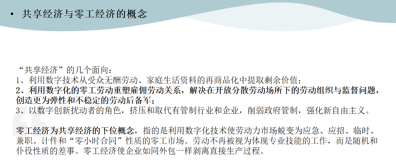 零工经济有两个比较明显的特征,一个是数字化特征、一个是灵活非稳定的就业特征。作者指出,我们应该关注零工经济灵活非稳定的就业特征而不是数字化特征,因为剥离了数字化的外表,零工经济就是临时劳动力的规制问题,而这不是一个新问题,是一个老问题。
