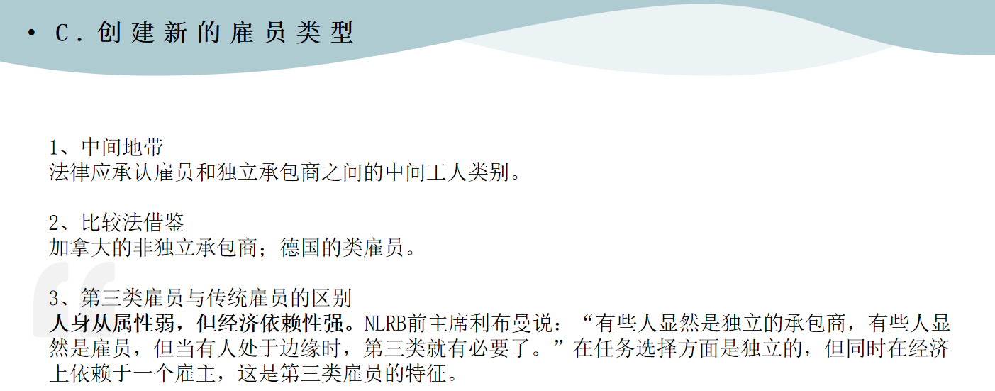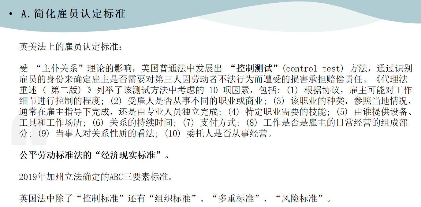 在文中作者还提及了经济现实标准的六要素判断,并肯定这是一种积极的变化倾向。但由于这篇文章的写作时间是在2016年,这篇文章就没有论及加州于2019年确立的ABC三要素标准,ABC三要素标准相比控制标准简化了很多,而且有利于保护工人,这个ABC三要素标准可能契合作者的观点,也就是简化雇员认定标准。