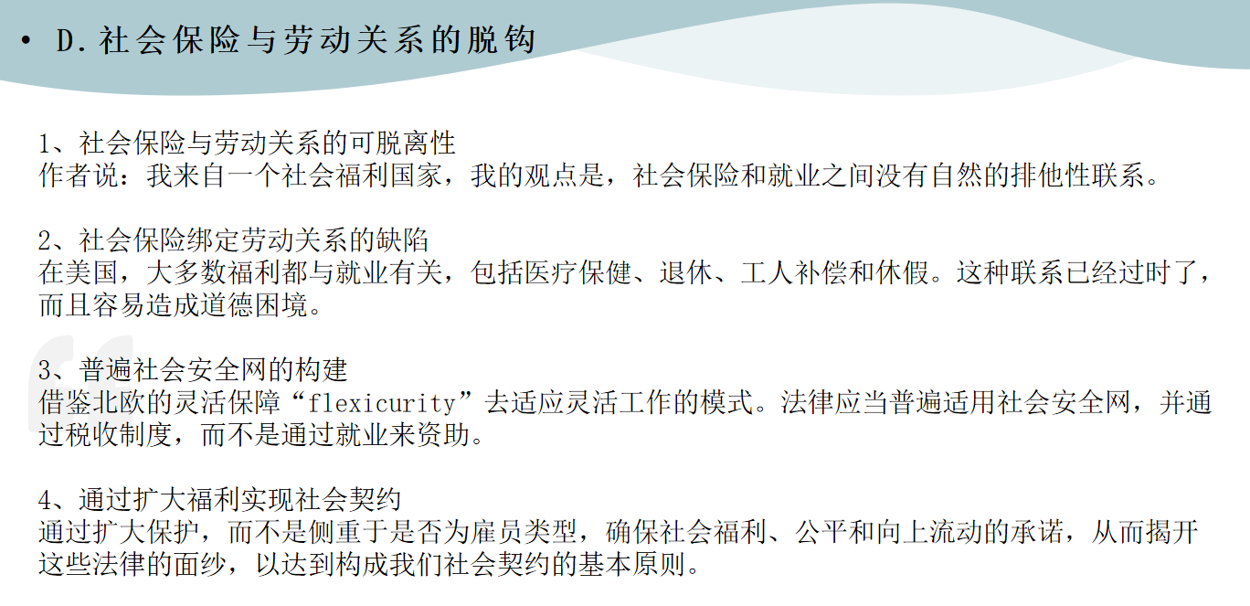 最后一个路径是令社会保险与劳动关系脱钩。作者首先指出了社会保险与劳动关系没有自然联系,因此社会福利与劳动关系是可脱离的;其次,作者指出社会保险绑定劳动关系所引起的问题,她认为这种联系是过时的而且容易引发道德困境。作者在阐述了社会保险与劳动关系脱钩的可行性和必要性后,又提出了如何脱钩的方法,她说应该借鉴北欧的灵活保障去建构一个脱离于劳动关系的普遍社会安全网,以适应灵活工作的模式,这个灵活保障的词根也是灵活与安全,她进一步提出这个普遍的社会安全网不通过就业来资助,而是通过税收制度资助。我理解这个不通过就业来资助就是不在雇员工资中按比例扣,不通过职工保险基金而是通过税收支撑。作者在这一部分进行了总结,即法律应该在平台经济中实现社会契约的承诺,即通过扩大社会社会保险制度,以确保所有工人都能享有公平待遇。