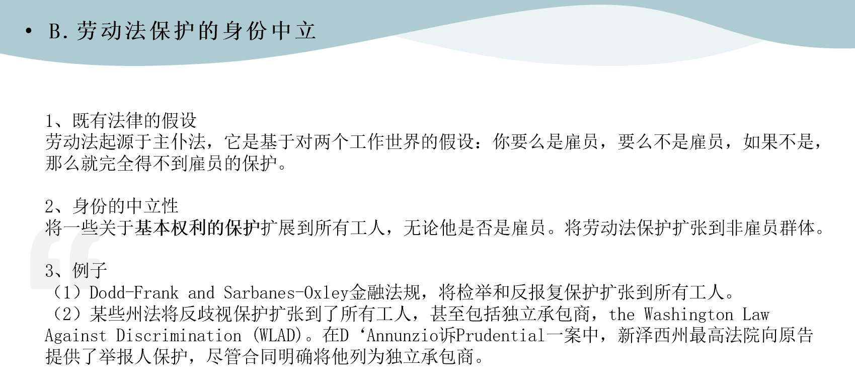 第二个路径是使劳动法的保护具有身份上的中立性。基于主仆理论的劳动法进行的是绝对的二分法,即要么是雇员、要么是独立承包商,如果是独立承包商则得不到任何劳动法的保护,中间没有任何过渡地带。因此作者就提出劳动法保护的身份中立性,即无论工作者是不是雇员,都可以适用劳动法的保护。文中举了两个例子,一个是将检举和反报复保护扩张到所有工人,一个是反歧视法扩张到所有工人甚至是独立承包商。值得注意的是,这些可以扩张到所有工人的劳动法保护都只是一些基本权利的保护,像检举和反报复是言论自由在职场领域的具体化,反歧视保护也是一项基本权利。