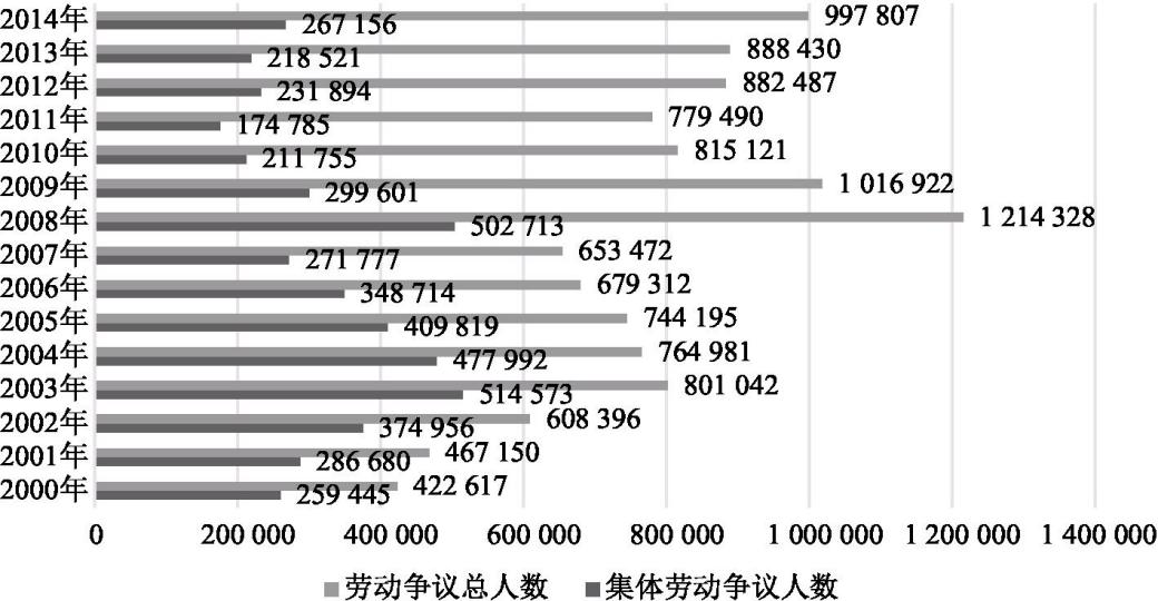 私力救济和公力救济是权利救济的两种基本形态,我国群体劳动争议、集体劳动争议很大程度上对应了这样两个概念。集体劳动争议作为一种法律上的分类,是可纳入正规处理程序的争议类型,通过国家强制力予以保障,采用公力救济的手段。群体劳动争议也被称为“群体性事件”,是在正常的劳动争议处理程序之外发生的争议,除了具有群体性的特点,更具有非秩序的特点,主要采用私力救济手段。2015年前,我国劳动争议一直呈现着群体劳动争议、集体劳动争议逆向发展的“二元”局面。