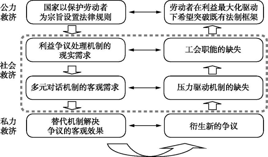 如果我们基于集体劳动争议、群体劳动争议、社团劳动争议进行理论抽象,便会发觉公力救济、私力救济错位,社会救济缺位,与“政府越位”互为因果,从而形成我国过度管制的制度逻辑。