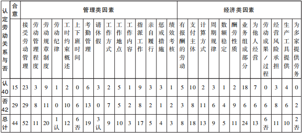 其次,“劳动管理”长期以来被司法部门作为核心标准广泛运用且能应对新就业形态带来的挑战。最高人民法院关于《为稳定就业提供司法服务和保障的意见》(法发〔2022〕36号,以下简称“稳定就业意见”)第7条和人力资源社会保障部办公厅关于《新就业形态劳动者劳动合同和书面协议订立指引(试行)》(以下简称“新业态劳动合同订立指引”)第4条均强调“劳动管理程度”为核心标准。《人力资源社会保障部、最高人民法院关于联合发布第三批劳动人事争议典型案例的通知》(人社部函〔2023〕36号)中的所有案例分析,也都指向劳动关系的核心特征“劳动管理”。如此青睐“劳动管理”,不仅因其是指导思想的外部呈现,而且因其更易于识别认定。下文展现法院综合衡量因素的表2反映了可类比于劳动从属性的“管理类”因素比含糊的“经济类”因素具有明显优势。15个“劳动管理”细节因素的衡量情况体现出其是认定劳动关系的核心标准,因为无论其因素数量还是衡量次数,均远胜于经济类因素。诚如德国联邦劳动法院法官林克(Rinck)所言,以人格从属性认定劳动关系是司法界和学界所能达成的最小共识。