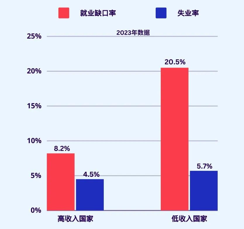 高收入国家和低收入国家之间仍然存在重大差异。2023年,高收入国家的就业缺口率(jobs gap rate)为8.2%,而低收入国家的缺口率为20.5%。与此类似,2023 年高收入国家的失业率保持在4.5%,而低收入国家则为5.7%。