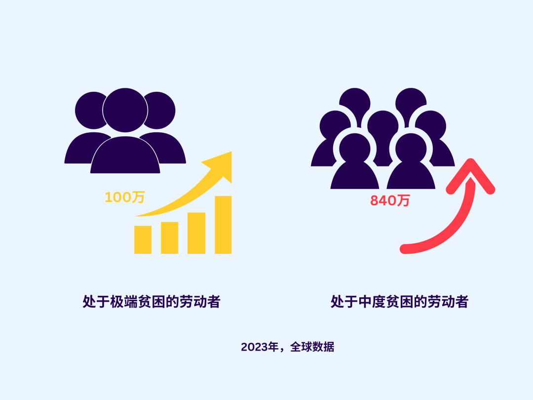 工作中的贫困情况可能会持续。尽管自2020年后,全球处于极端贫困的劳动者(按购买力平价计算,人均日收入低于2.15美元)人数迅速减少,但2023年,这一群体仍增加了100万人;处于中度贫困的劳动者(按购买力平价计算,人均日收入低于3.65美元)增加了840万人。