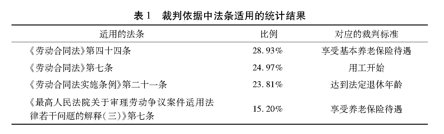 第二,通过对裁判结果和法条适用进行关联分析,可发现司法实践中存在的法条适用分歧。具体而言,裁判依据中法条呈现分散样态,裁判标准模糊,按适用频率展示如表1。适用最多的是《劳动合同法》第四十四条,占比为28.93%,但所占比例也较低,并未达到绝对多数。法条适用的分歧不仅会损害司法预期,有损《劳动合同法》的权威,更使超龄劳动者劳动权益难以获得充分保障。