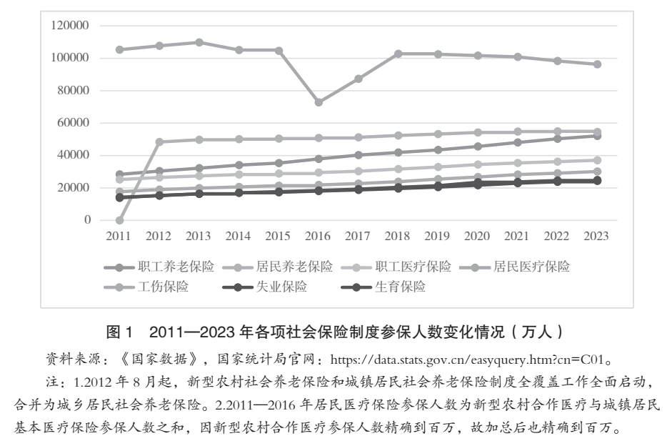 党的十八大以来,让国家发展成果更多更公平地惠及全体人民成为基本政策取向,党中央把社会保障体系建设摆上了更加突出的位置。目前,我国已经建立了全世界覆盖人口最多的社会保险体系,有效地维护了广大劳动者的社会保险权益。人民群众不分城乡、地域、性别、职业,在面对年老、疾病、失业、工伤等风险时都有了相应制度保障。图1直观展现了2011年到2023年各项社会保险制度参保人数的变化情况。