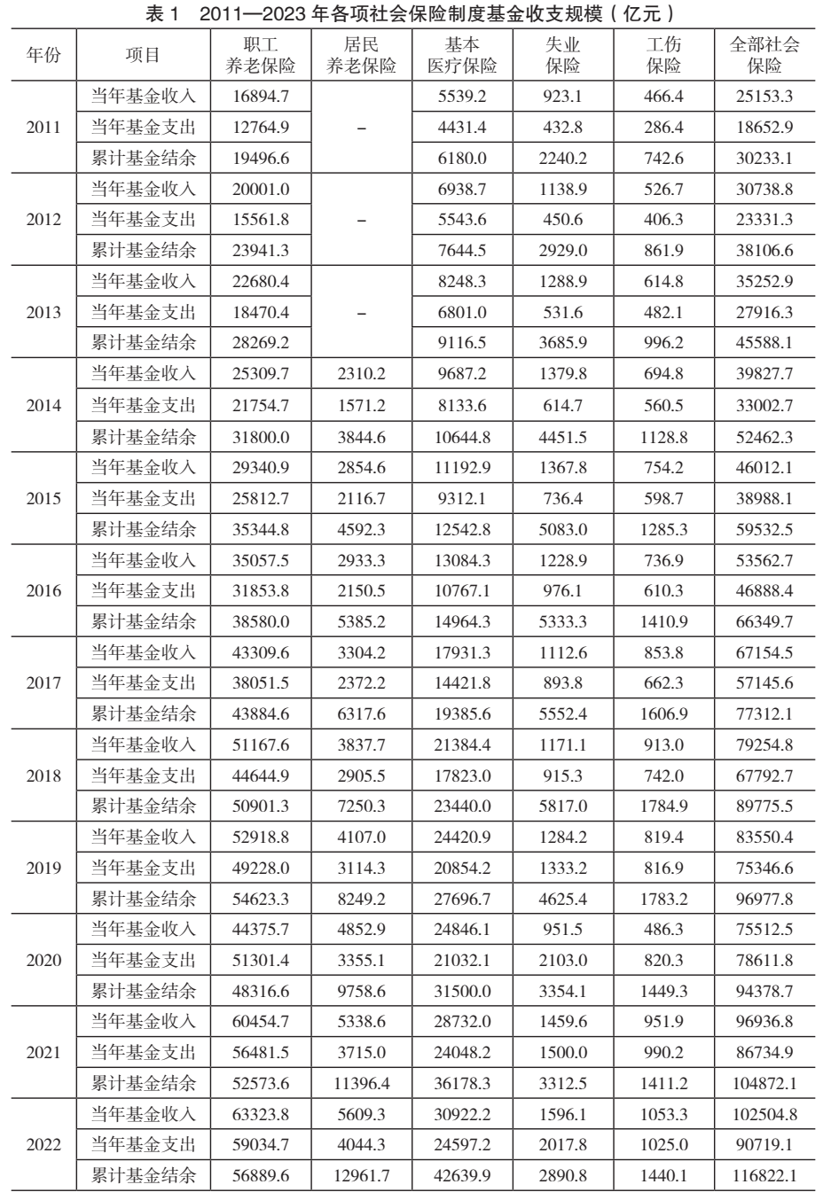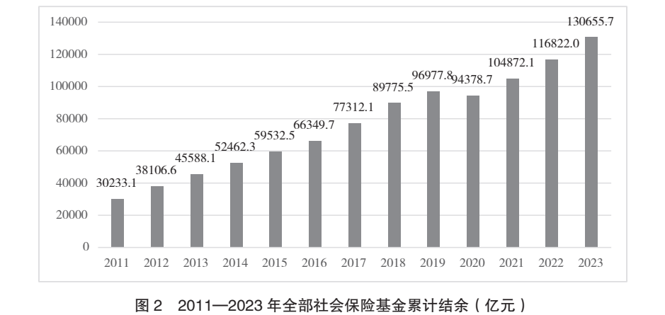 社会保险基金是社会保险制度运行的物质基础,随着我国经济发展水平的不断提高和财政对社会保险投入的持续增长,社会保险基金收支规模持续扩大,呈现的是稳健发展的态势。表1显示了2011年以来各项社会保险制度的当年基金收支和累计结余情况,图2显示了2011年以来全部社会保险基金累计结余的增长情况。各项社会保险基金的累计结余从2011年的3万亿元增长到2023年的13万多亿元,如果再加上全国社会保障基金理事会管理的用于应对人口老龄化高峰需求的战略储备基金,我国社会保险基金累计结存规模已经接近16万亿元,占当年GDP的比重约为12.7%。以遵循现收现付原则的基本医疗保险为例,2023年累计结余达到4.79万亿元,是上一年度基金支出的1.95倍,其他各项险种的累计结余基金可支付年份也都超过一年,所显示的是基金累计结存规模偏大的格局。因此,在世界各国普遍采取现收现付财务机制的情形下,我国社会保险制度总体上并不存在基金不足的问题,而是形成了制度性缺陷所造成的统一性、互济性不足导致各地基金余缺不一的非正常格局。