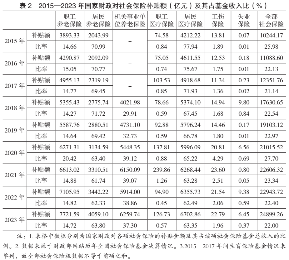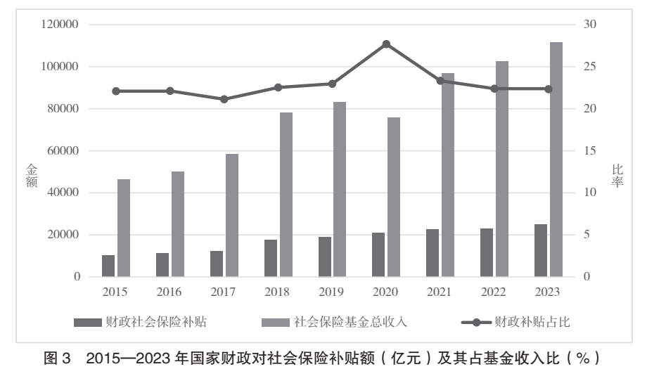 表2和图3展示了国家财政对各项社会保险制度的补贴金额及其占各项社会保险基金收入的比例,从中不难发现,财政资金占社会保险基金总量的比例在25%左右,在居民养老保险、居民医疗保险基金中的占比接近2/3,为各项社会保险基金规模的持续壮大发挥了积极作用。与此同时,为了提高基金运行的安全性,根据《社会保险法》第65条至第67条的相关规定,财政部门于2022年牵头印发了《社会保险基金预算绩效管理办法》,将社会保险基金预算全面纳入了绩效管理。