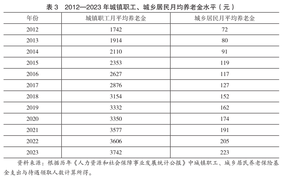 在养老保险方面,随着个人缴费水平伴随收入增长而持续提高和财政投入力度的持续加大,养老金也在连年增长。如表3所示,2012—2023年,城镇企业退休人员月均养老金水平从1742元提高到3742元,城乡居民养老金从72元提高到223元,涨幅分别为114.8%和209.7%。
