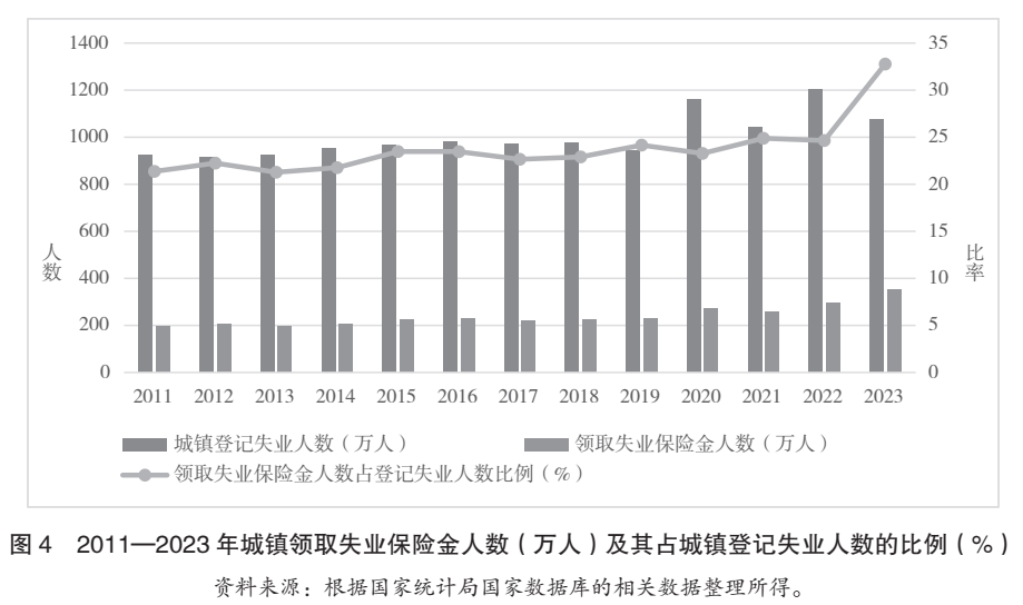 社会保险制度是一个由多项目分工负责解除特定的不确定性生活风险的制度体系,结构均衡地向前推进是充分发挥其综合效能的正确取向。但在现行社会保险制度体系中,不同保险项目之间存在失衡现象。养老金最受重视,医保次之,工伤、失业保险较被忽略,护理保险还未真正建立,而根据德国、日本两个长寿大国的实践,当老龄化由轻度进入中度后,医疗保险、护理保险变得至关重要。在制度功能方面,居民养老保险根本不足以解决参保对象老年基本生活的经济来源问题;医疗保险尚未充分与公共卫生、健康促进等政策形成有效协同;工伤保险仅聚焦于工伤发生者的基本生活保障,“预防、补偿、康复”的三位一体格局还没有真正建立;失业保险仅局限于保障体制内正规就业群体中登记失业劳动者的基本生活,预防失业、稳定就业、促进就业的功能亟待拓展,最直观的表现就是领取待遇人数在登记失业人数中长期占比较低(见图4);生育保险未能有效覆盖非受雇劳动的女性,无法对国家鼓励生育的政策形成有效支撑。