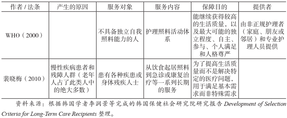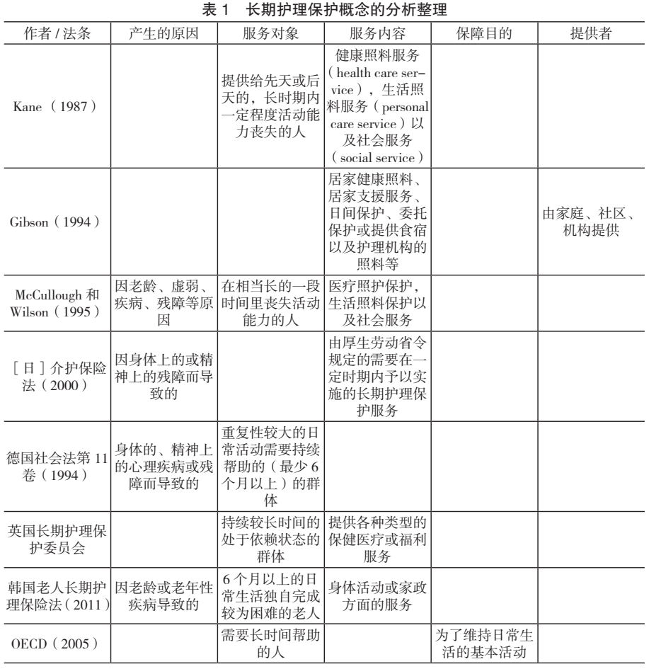 长期护理来自于人口老龄化下应对老年失能失智的风险需求,基于社会风险,国际上提出了“长期护理保护”(long-term care protection)的概念,即针对长时期丧失一定活动能力的人群提供的某种照料和支持服务。长期护理保护产生的原因、服务对象、服务内容、保障目的以及提供者在理论上具有较为完整的界定。如表1。