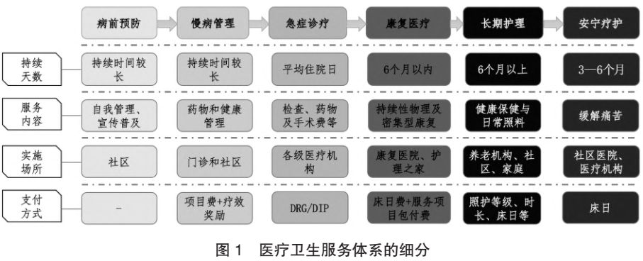 一种观点认为,狭义的长期护理概念,只作为医疗卫生服务链条中一个组成部分。这种观点为“医养整合”提供了充分的依据。在医疗卫生服务概念中,“急症诊疗”作为“为了缓解病痛而进行的干预或改变特定健康状态的活动”,曾是医疗卫生服务链条中占据绝对比例的核心。医疗卫生领域的医保筹资机制、待遇支付方式等制度设计往往率先围绕急诊症疗行为而展开。伴随着慢性病患者的占比不断提升,以及术后的康复医疗与身体功能丧失的失能失智群体的出现,使得医疗卫生服务领域的覆盖群体范围逐渐拓宽,服务内容不仅包括了慢病管理、康复医疗、长期护理,在全生命周期概念的强化与人道主义关怀下,病前预防与安宁疗护也纳含其中。因此,现代的医疗卫生服务至少包括病前预防、慢病管理、急症诊疗、康复医疗、长期护理和安宁疗护六个部分。在六个模块中,服务对象的持续天数、服务内容、实施场所和支付方式上均有明显的异质性(具体如图1),但并非因此衍生出六项制度,而是通过对六个模块精细化管理以达到医疗卫生资源的有效利用。简言之,依照“患者”的身体状态展开评估,提供与之相适宜的医疗卫生服务,设计差异化的支付方式,细分链条中的每一环节。
