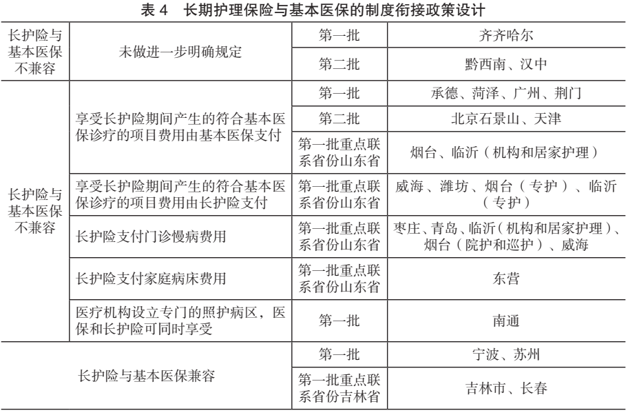 如表4所示,部分试点城市设计两制度时采取“不兼容原则”,即“应当由医疗保险支付的,即便发生长期护理费用,也不纳入长护险基金支付范围”。但各地的处理方式有些差别,例如享受长护险期间产生的符合医保目录范围内的诊疗项目,承德、菏泽等地规定由基本医保支付,但威海、潍坊等地规定享受长护险期间产生的诊疗项目应由长护险支付。除此之外,山东省部分试点地区规定门诊慢病费用由长护险支付,东营规定家庭病床费用由长护险支付。另外,个别地区还设计了一些除外项目,例如南通市规定,可以在医疗机构内设立专门的照护病区,在照护病区内,经备案后可同时享受基本医保和长护险待遇,但是入住照护病区的,医保费用支付也采用按床日结算的方式。