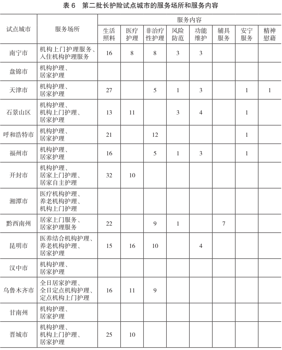 第一批长护险试点城市的服务场所,尤其是较早期自主开展地方试验的城市,例如青岛、长春、苏州,都将医疗机构作为服务场所的一个重要组成部分,在第二批试点城市中,普遍以养老机构和家庭为主要场所,但也有个别地区,如湘潭市包括了医疗机构、昆明市包括医养结合机构。