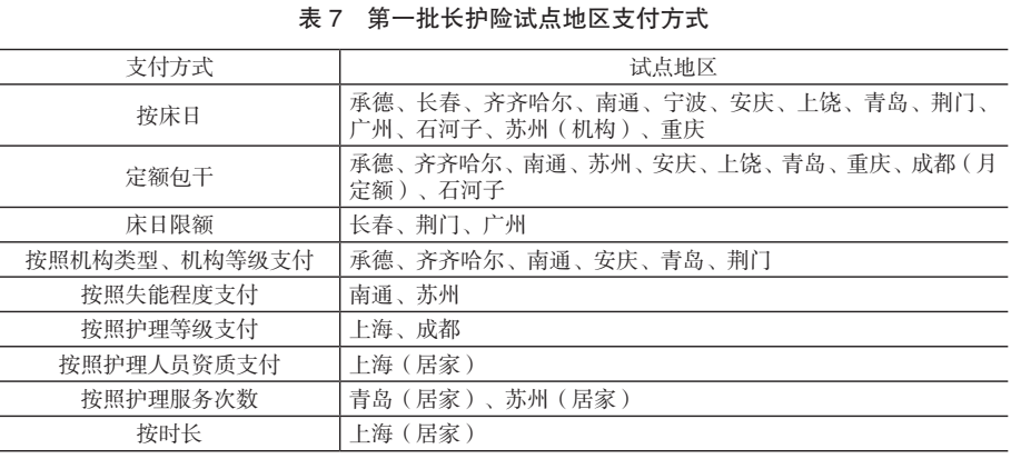 在第一批试点城市中的大部分地区规定机构护理按床日来支付,其中10市实施定额包干,长春、荆门和广州实施床日限额。在机构护理中,承德、齐齐哈尔、南通、安庆、青岛和荆门均采用按照机构类型和机构等级支付的方式,南通、苏州按照失能程度来支付,上海、成都按照护理等级支付。在居家护理中,青岛和苏州按照护理服务次数支付,上海则采用了按照服务时长和护理人员资质来支付的方法。目前来看,采用按床日支付的方式占据绝对比例。