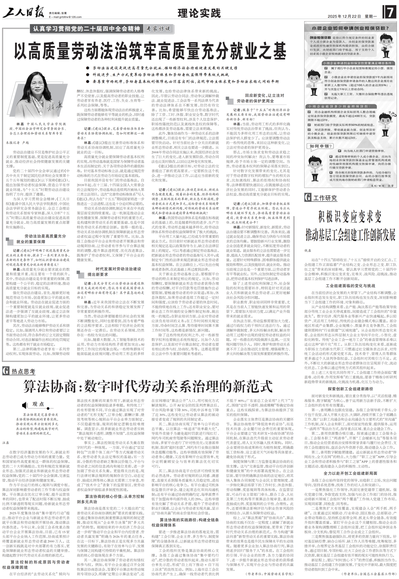 劳动关系协商协调机制近年来在中央政策层面受到持续重视。这一机制是推动企业良性健康发展、保障劳动者权利的重要方式,是构建和谐劳动关系的重要基础,也是中国特色劳动关系的理论创新。值得一提的是,劳动关系协商协调机制在保障新就业形态劳动者权益过程中发挥了重要作用。比如,各级工会推动平台企业和劳动者开展算法和劳动规则协商,让劳动者有序参与平台算法规则的调整,提升算法透明度、优化改进算法,既维护了劳动者权利,又保障了平台企业的健康发展。