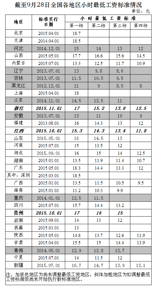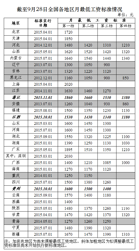 截至9月28日,全国各地区月最低工资标准中,深圳以每月2030元跃居首位;上海以2020元位列次席;广东以1895元排名第三。而月最低工资标准垫底的黑龙江,每月最低工资标准仅为1160元。